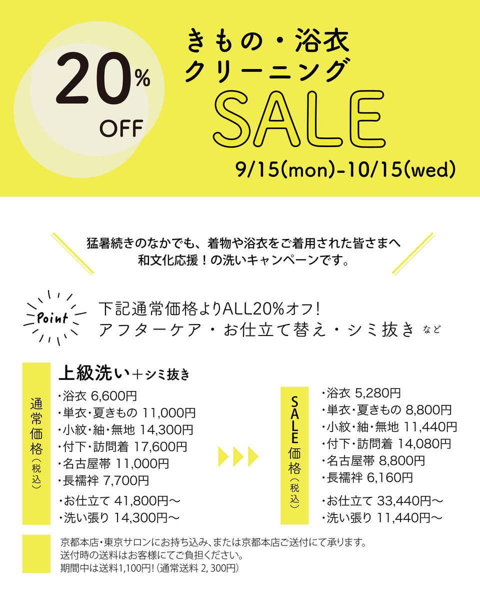 猛暑続きの中でも、 着物や浴衣をご着用された皆さまへ、 和文化応援!の着物洗いキャンペーンです。 9月に入りキモノは薄物から単衣に衣替え。 夏に着用した着物や浴衣のお片付け前に 着物を丸洗いすることで、 シミや虫を防いで来年以降も気持ちよく 着用することができます。 西村兄妹キモノ店では、 「きもの・浴衣クリーニングセール」 を実施いたします。 クリーニングに加えて、お仕立て替えや シミ抜きなども割引価格で承ります。 大切な浴衣やキモノのお手入れに ぜひこの機会をご利用ください。 ご利用の際は、下記の公式LINE からお気軽にご連絡くださいませ。